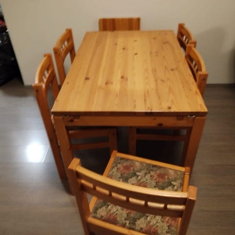 Myydään ruokailuryhmä. Koivu liimalevystä taso ja penkkien kannet. Penkkien jalat metalliset. Pöydän jalat puuta.