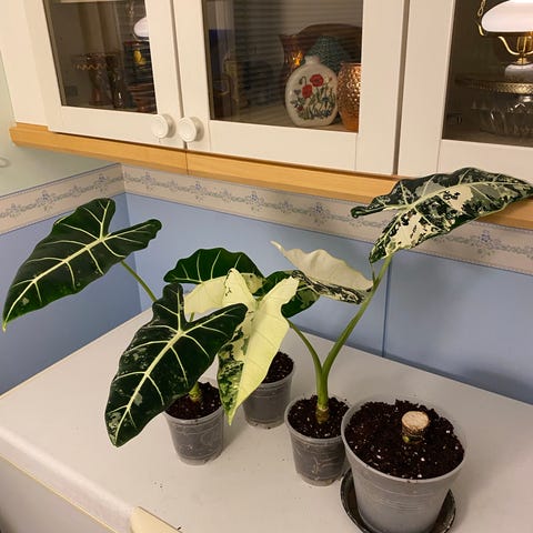 Alocasia Frydek Variegata -mukuloita. Toisessa kuvassa emokasvi. Ollut minulla vuosia ja olen useasti uusinut mukuloista, värivirhe on aina säilynyt hyvin mukana.