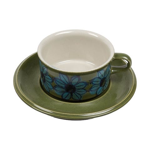 Kuppi ja aluslautanen on valmistettu keramiikasta. Astioissa on kiiltävä lasite ja kupissa on pyöristetty korva. Muotoilu on selkeälinjaista ja pelkistettyä.Suunnittelija: Hilkka-Liisa AholaKupin mitat (HxK) ovat noin 10 x 5 cmLautasen halkaisija on noin 16 cmValmistaja: ArabiaVäri: vihreä, sininenMateriaali: keramiikka