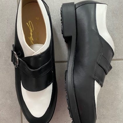 Nahkaiset naisten golfkengät, koko 40. Väriltään tummanvihreät, joissa koristeelliset rei’itykset ja irrotettava hapsullinen päälliläppä. Pohjassa kuminen nappulapohja, joka antaa pitoa. Hyväkuntoiset.