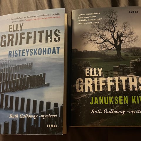 Elly Griffiths dekkaripaketti sisältää suomennettuja rikosromaaneja. Kuvissa näkyvät Ruth Galloway -sarjan osat sekä erillinen Harbinder Kaur -sarjan romaani "Murhan käsikirjoitus". Kirjat ovat kovakantisia suomenkielisiä dekkareita, joissa yhdistyvät arkeologia, poliisitutkinta ja nykypäivän rikosjuonet. Paketti sopii lukijalle, joka etsii sarjamuotoisia brittidekkareita ja haluaa useamman osan samalta kirjailijalta yhdellä kertaa.