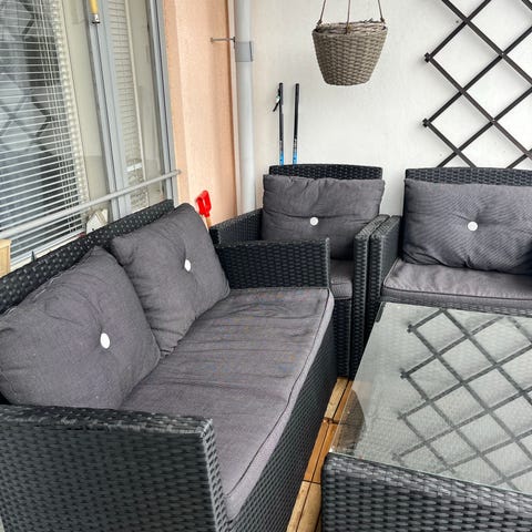Parvekesohvaryhmä, joka sisältää kahden hengen sohvan, kaksi nojatuolia ja pienen suorakaiteen muotoisen pöydän. Kalusteet ovat mustaa polyrottinkia ja niissä on vaaleanharmaat istuinpehmusteet. Sopii parvekkeelle tai terassille oleskeluryhmäksi.