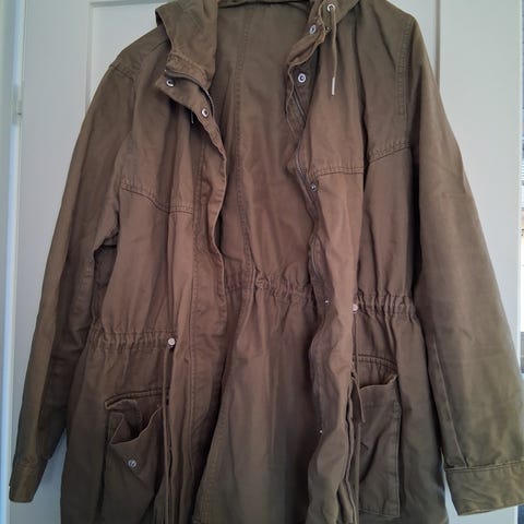 Lexingtonin vihreä takki jämäkkää puuvillaa, ei vuorikangasta. Käytetty kunto, kankaassa kulumaa, mutta sopii tyyliin. Koko XL, mutta menee esim. M-koolle väljempänä ja esim. neule mahtuu alle. Myynnissä myös muualla.