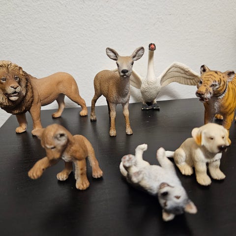 Schleich eläinfiguurit. Settiin kuuluu useita eri eläinhahmoja, kuten koiria, tiikereitä, norsu ja sika sekä pieni laatikko/tarhaelementti. Muoviset figuurit on yksityiskohtaisesti maalattu ja sopivat lasten leikkeihin tai kokoelmaan. Koko ja mittakaava ovat Schleichin tyypillistä eläinfiguurikokoa. Myydään settinä.