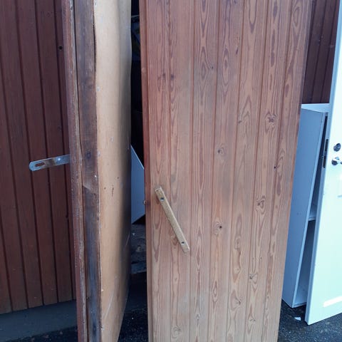 Parikymmentä vuotta käytössä ollut ovi karmeineen. Puu runko, "lasit" pleksiä.