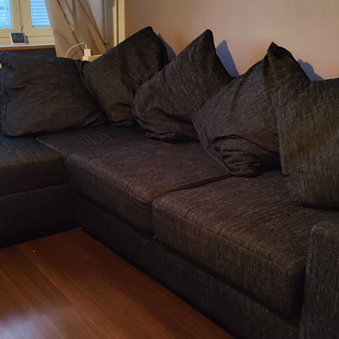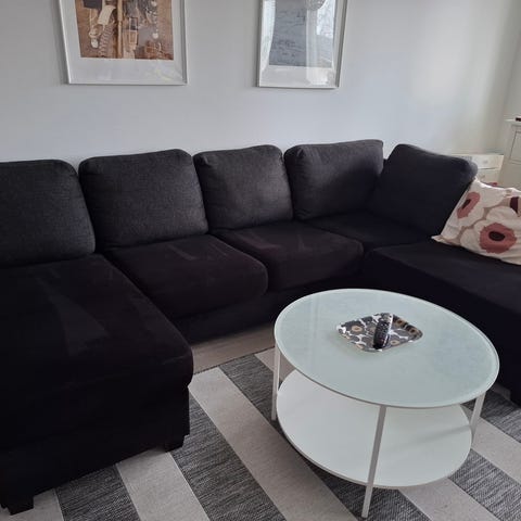Myyntiin iso vaalean beigen värinen bellus-kulmasohva.