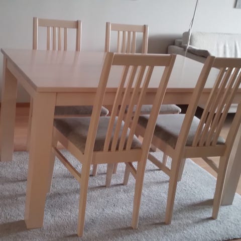 Täyspuinen laadukas ruokailuryhmä; pöytä + 6 tuolia. Mäntyä. Tukeva ja hyväkuntoinen. Pinnassa luonnollista ajan tuomaa käytönjälkeä. Tuolit voittaneet 2000 luvulla muotoilupalkinnon (nimi ei muistissa).