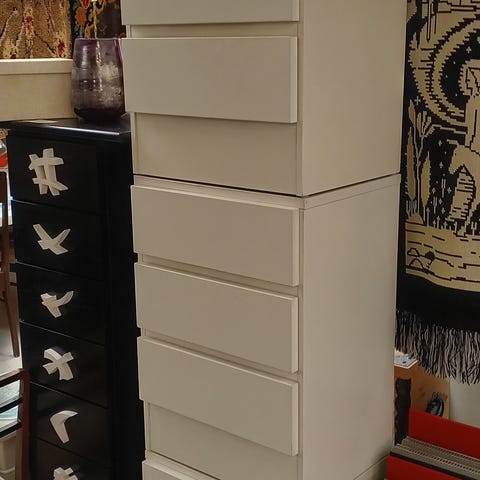 Laatikosto pylväs kuudella laatikolla ja keraamisilla vetimillä.