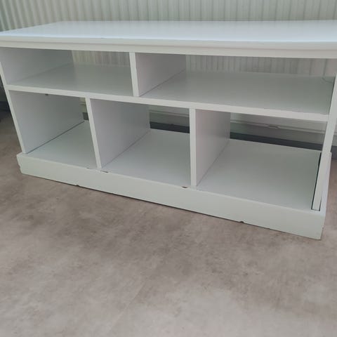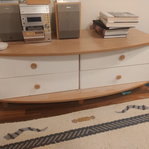 Elämää nähnyt, mutta toimiva TV-taso. Pinnassa naarmu (näkyy kuvassa). Laatikot toimii.