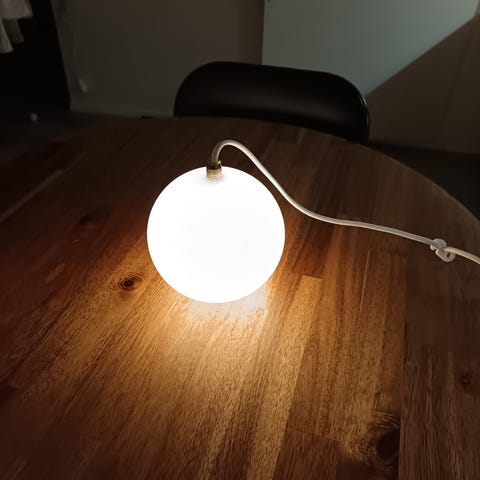 korkeus n 22 cm, toimii kahdella pyöreällä litteällä paristolla, valo syttyy painamalla päällä olevaa valkoista nappia