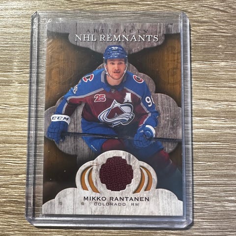 Upper Deck SP Game Used Nations Face-Off Fabrics -sarjan jääkiekkokortti, jossa pelaajana Mikko Rantanen Suomen maajoukkueesta. Kortissa on pelipaitapala ja se on suojakotelossa. Sarjan ja pelaajan tiedot on painettu kortin etu- ja takapuolelle.