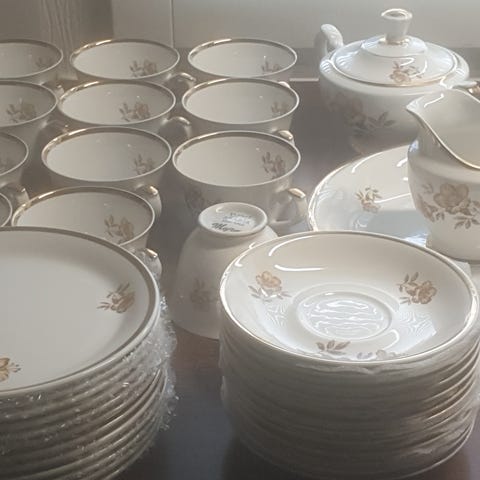 Myydään hyväkuntoinen Arabian myrna astiasto. 12 kahvikuppia, 12 tassia, 9 lautasta, tarjoiluvati, kermakko ja 2 sokerikkoa ilman kantta. Yhdessä kupissa pikku halkeama. Astiat ilmeisesti eri aikakausilta leimojen perusteella. Saa tarjota!