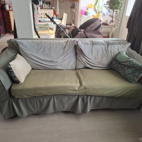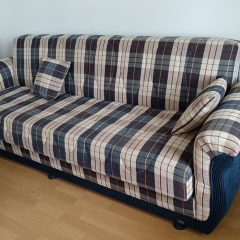 Todella siisti ja hyväkuntoinen sohva. Jämäkkä ja hyvä istua/nukkua. Tummanharmaa väri. Koirakoti mutta sohvan istuinosat ovat olleet peitetty aina, siksi ei likaa tai tahroja. Ainut erhe on yksi divaanin nurkka jota koira pentuna nakersi, paikattu samanvärisellä kankaalla, näkyy kuvissa. Divaanissa todella isosti säilytystilaa. Tyynyjen päälliset vetoketjulla eli saa pois. Sohvan saa helposti osiksi ja divaanipuolen muutettua. Saa tulla katsomaan yltä ympäri. 🙂