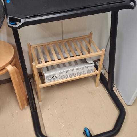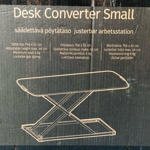 Säädettävä täyspuinen työpöytätaso kannettavalle tietokoneelle ja näppäimistölle seisomatyötä tai myös istumatyötä varten. Saa näytön ylös pöydältä, eikä tarvitse istua niska kyyryssä, sekä voi vaihdella joustavasti asentoa seisovasta istuvaan vaikka ei olisi sähköpöytää käytössä.