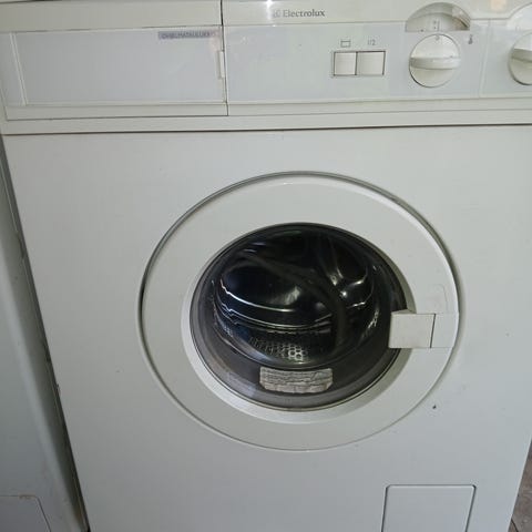Käyttämättömäksi jääny edestä täytettävä pyykinpesukone.