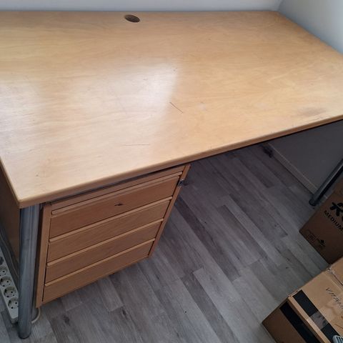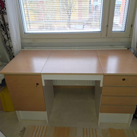 Pitkään käytössä ollut pöytä, kolhuja ja maalivaurioita. Laatikot ja kaapit kunnossa. Vain nouto.