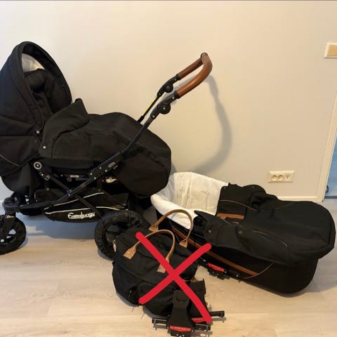 Emmaljunga lastenrattaat runko (450€) ja irrotettava istuinosa (150€).