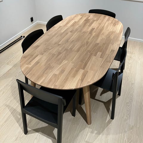 Ruokapöydän kansi on siisti eikä siinä ole kolhuja. Pöytälevy toisesta reunasta hieman kalteva. Jalat ja tukikehikko ovat hyvässä kunnossa, voit suoristaa kannen tai vaihtaa uuden.