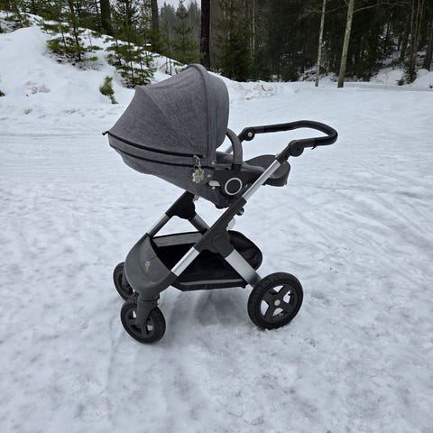 Suoraan käytöstä Stokke Trailz vaunukoppa harmaalla päälliskankaalla ja vaalealla sisävuorella. Vaunukopassa on kuomu, irrotettava peite ja kantokahvat sivuilla. Sisällä on pehmustettu patja vauvan makuualustana. Sopii käytettäväksi yhteensopivien Stokke-runkovaunujen kanssa vastasyntyneestä alkaen makuuasennossa kuljettamiseen. Jotain käytön jälkeä on vaaleassa kankaassa, näkyy kuvissa.