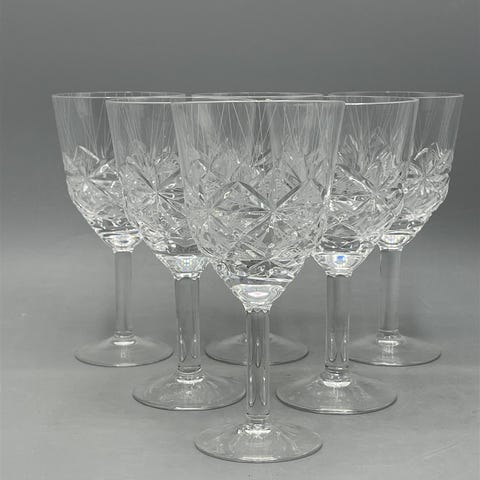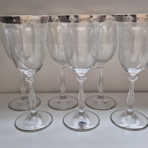 Bohemia kristalli viinilasit 6kpl, joissa on kaiverrettu koristekuvio. Jokaisessa lasissa on koristeellinen jalkaosa.