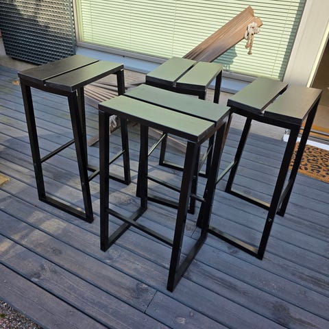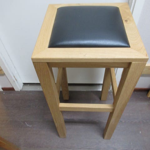 Tammiset baarijakkarat ruskealla nahkaistuimella. Istuinkorkeus 75 cm. Tavanomaista käyttökulumaa. Nouto Pitäjänmäestä tai Haukilahdesta.
