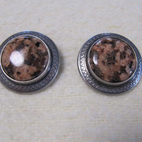 Tummunut, muuten ei kunnossa moitittavaa. Halkaisija 25 mm. Leimat kuvissa. Hopeaa ja kiviosa graniittia.