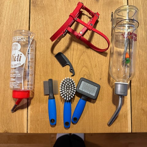 Puinen labyrintti, parit tikkaat (toisen saa roikkumaan), kaksi köysilelua (toisen saa roikkumaan). Labyrintti on käytetty gerbiileillä, muut käyttämättömiä.