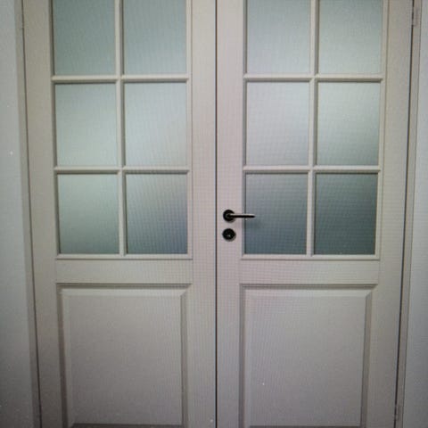 Valkoinen lasiruudukollinen 15x21 pariovi sisäkäyttöön. Toisessa ovessa lukitus mahdollisuus. Aukon koko 150x210cm. Karmit ja ovenkahva mukaan. Kunto siisti jotain pieniä käytön jälkiä.
