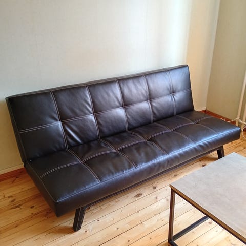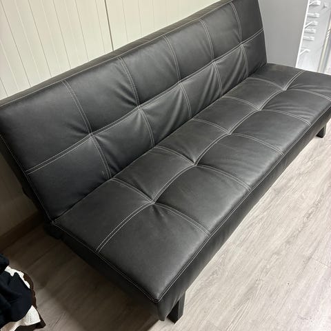 Musta keinonahkainen vuodesohva. Selkänojan saa asetettua kolmeen eri asentoon, istuva, 1/2 istuva ja makuu. Hyväkuntoinen. Selkänojan päällä muutama valkoinen jälki, näkyy kuvassa.