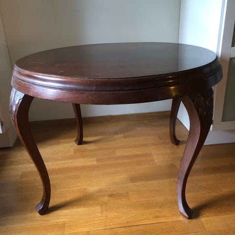 Siitä jollekkin entisöinti kohde.Itsellä ei aika riitä.En tiedä mistä pöydän läikät ovat tulleet,mutta pinta kannattaa siklata.Muuten ehjä hyvä pöytä.Vain nouto.
