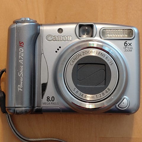 Canon PowerShot A590 IS digikamera. 8 megapikselin kennolla varustettu kompaktikamera, jossa 4x optinen zoom (Canon Zoom Lens 5,8–23,2 mm, f/2,6–5,5) ja optinen kuvanvakain (Image Stabilizer). Kamerassa on sisäänrakennettu salama, takana LCD-näyttö ja ohjauspainikkeet sekä ohjelmavalitsin ylhäällä. Väri harmaa/metallinen. Kuvissa mukana käyttöohjeita ja Canonin ohjelmisto-CD-levyjä sekä SD-muistikortti. Ei naarmuja tms.