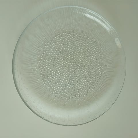 Iittala lasimaljakkosetti ja kulhot kirkasta lasia. Kuvissa näkyy kaksi erikokoista, kohopintaisella kuviolla olevaa lasimaljakkoa sekä matala, leveä kulho ja pienet lasikulhot. Mitat näkyvät kuvien mittanauhoista, esimerkiksi korkeamman maljakon korkeus on noin 20 cm ja leveämmän kulhon halkaisija noin 25 cm. Sopivat esimerkiksi kattaukseen, säilytykseen tai sisustuselementeiksi. Kaikki osat ovat kirkasta, läpikuultavaa lasia yhtenäisellä teksturoidulla pinnalla.