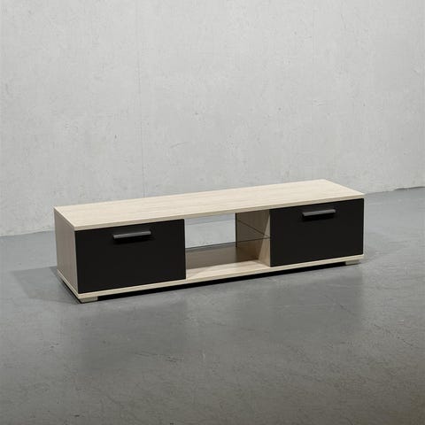 TV-taso 133cm leveydellä, kulmikas muoto, jossa on kaksi lasiovellista kaappia reunoilla ja kaksi vetolaatikkoa. Tason keskellä on avohylly.