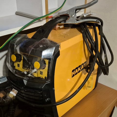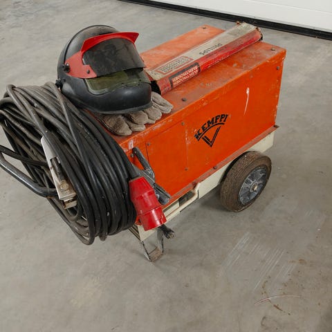 Kemppi EKA 200 hitsauskone. Suomessa valmistettu muuntajapohjainen puikkohitsauskone, jossa säätöpyörä hitsausvirran asettamiseen. Laitteessa on pyörillä varustettu runko ja kantokahva siirtämistä varten sekä hitsauskaapelit. Tekstikilven mukaan maksimihitsausvirta on 200 A ja laite toimii 380 V verkkojännitteellä. Soveltuu teräsrakenteiden ja erilaisten metallikappaleiden puikkohitsaukseen esimerkiksi korjaus- ja rakennustöissä.