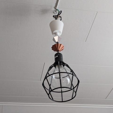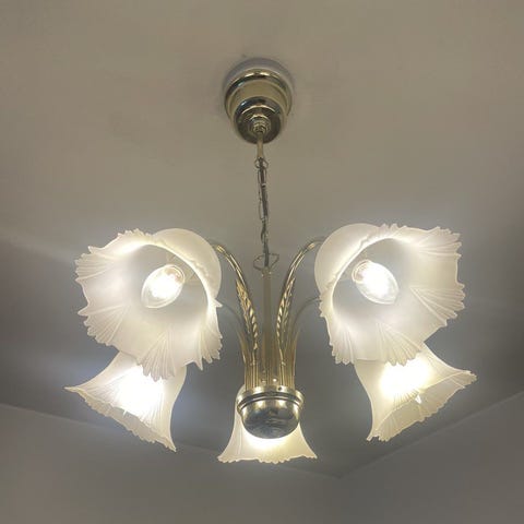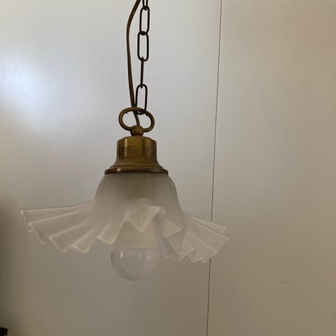 Hopeanhohtoinen kaunis kattolamppu. Valo siivilöityy kauniisti hopean värisen kuvun läpi. Pistokkeellinen kiinnitys. Toimii.