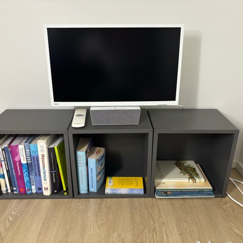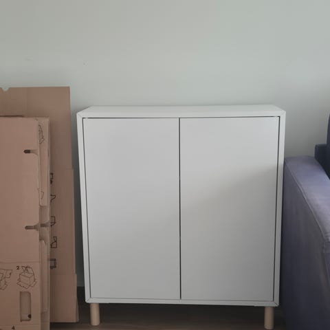 Kaksi Ikea Eket kaappia. Toiminut TV tasona, jonka takia porattu reiät johdoille. Etureunassa kolme jalkaa. Kaapit kiinnitetty toisiinsa. Muitakin reikiä kiinnityksistä on muutamia.