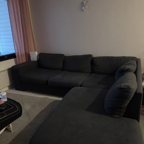 Keväällä 2025 uutena ostettu iso kulmasohva.