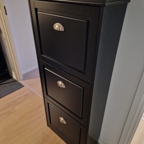 Seinään kiinnitettävä puinen kenkäkaappi. Kolme erillistä laatikkoa, johon jokaiseen mahtuu 3kpl aikuisen kenkiä, eli koko kaappi vetää 9 paria yhteensä.