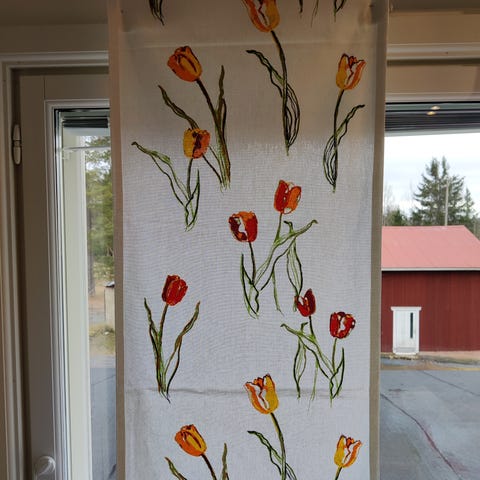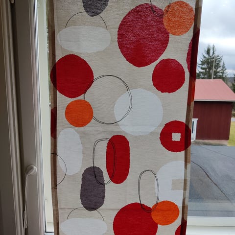 Koko on noin 50 x 206 cm. Materiaali on 50 % polyesteriä ja 50 % puuvillaa. Hoito-ohjeiden mukaan pesu 40 °C, ei valkaisua, ei rumpukuivausta, silitys nurjalta puolelta. Sopii esimerkiksi verhoksi tai sisustustekstiiliksi kodin eri tiloihin.