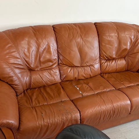 Valkoiset nahkasohvat (kapeamman leveys 128) + rahi. Nämä ovat olleet käytössä jo vuosia, joten käytön jälkiä on erityisesti saumoissa ja kulmissa sekä tummentumia istumakohdissa. Muutoin ehjät.