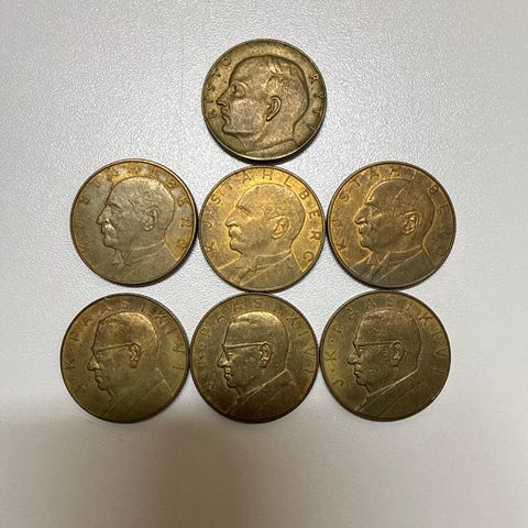 Erä erilaisia vanhoja kolikoita ja yksi seteli. Kolikot ovat eri kokoisia ja eri metalleista valmistettuja, osa kuparin- tai pronssinvärisiä, osa hopean- tai kullanvärisiä. Seteli on painettu paperille ja siinä on tekstiä sekä kuvioita. Sopii esimerkiksi keräilyyn, rekvisiittaan tai opetuskäyttöön. Tarkemmat maat, nimellisarvot ja vuosiluvut eivät käy ilmi ilmoituksen tiedoista.