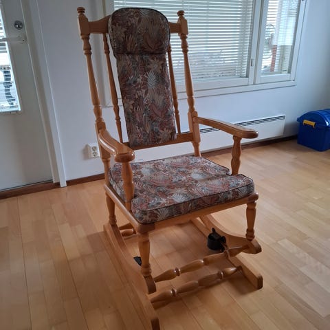 Hyväkuntoinen, ajan patimoima keinutuoli. Selkänojan korkeus 77 cm ja jalakset 110 cm.