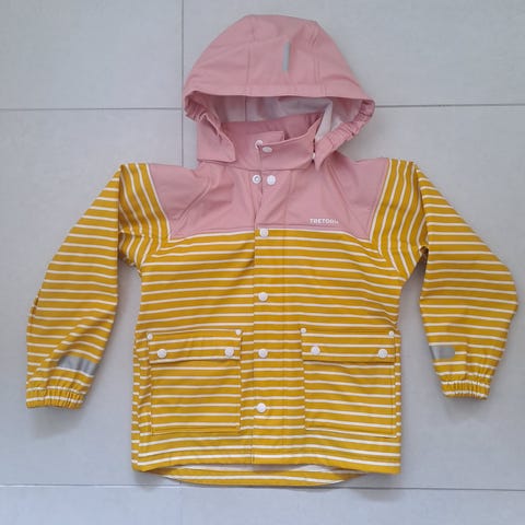 Tummansininen tretorn sadetakki ja housut. Molemmissa fleecevuori. Koko 122/128cm. Kulumaa polvissa ja takin kaulus rikki. Takissa vetoketju.
