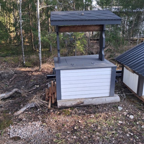 Puinen kaivoaiheinen koirankoppi, jossa kahdeksankulmainen runko ja harjakatto. Kopin seinät ovat punaiset ja listoitus sekä katoksen tukirakenteet harmaat. Sisäänkäynti on kaareva aukko yhdessä sivussa. Yläosassa on kaivon luukkua muistuttava aukko ja koristeellinen katos. Soveltuu pihalle koiran suojaisaksi lepopaikaksi tai piharakennuksen koristeelliseksi eläinsuojaksi.