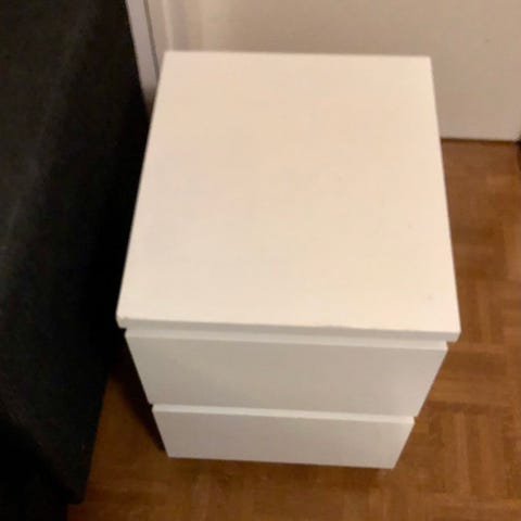 Hyvässä kunnossa oleva valkoinen IKEA:n yöpöytä. Oikeassa etukulmassa kulumaa.
