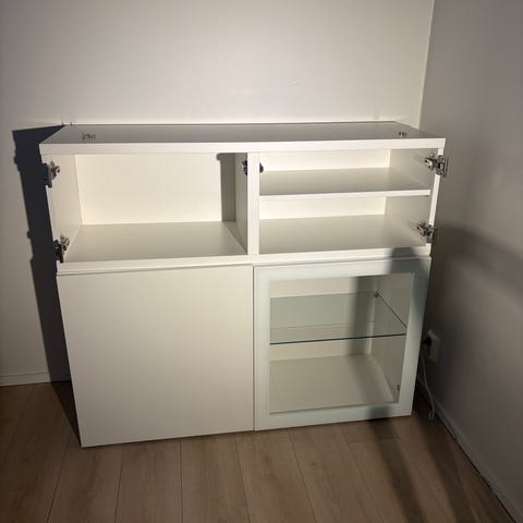 Myydään 2 kpl Ikean BESTÅ senkki (120x42x74 cm) sekä saman sarjan lasilevyt.