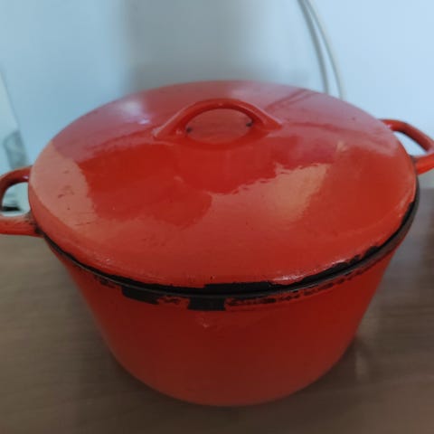 Keltainen Högfors valurautapata. Vähän ajan patinaa sisällä. Suunnittelija Antti Nurmesniemi. Mitat 19/15 cm, korkeus 8 cm. Nouto Porvoosta tai ehkä postitus.