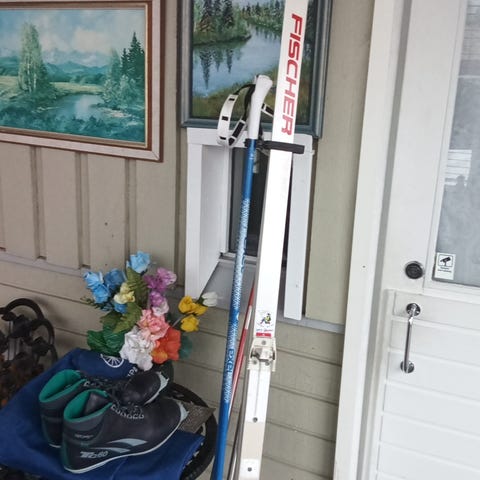 Hiihtosetti, johon kuuluu sukset, sauvat ja monot.