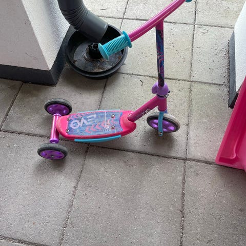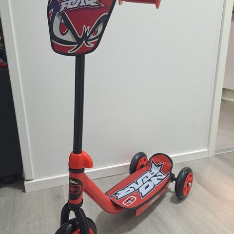 Myydään lasten kolmipyöräinen potkulauta. Ohjaustangon korkeus on säädettävä. Renkaat välkkyvät. Säilytetty lämmitetyssä varastossa.