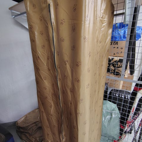 Metallinen maalattu pukukaappi kahdella osastolla. Korkeus 188cm, leveys 60,5cm, syvyys 50,5cm. Sisällä ylähylly, tanko ja muutama vaatekoukku. Ruosteisia kohtia maalattu hopeisella ruosteensuojamaalilla. Maalipinta kulunut, muuten ihan kunnossa. Vain nouto.